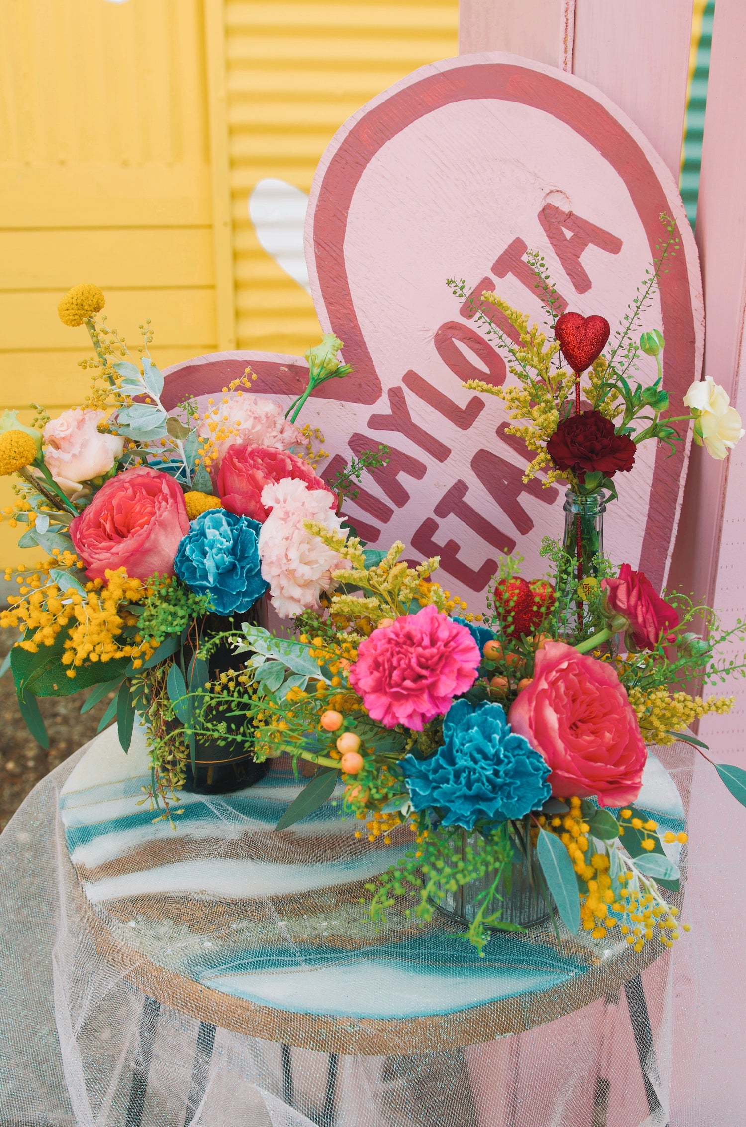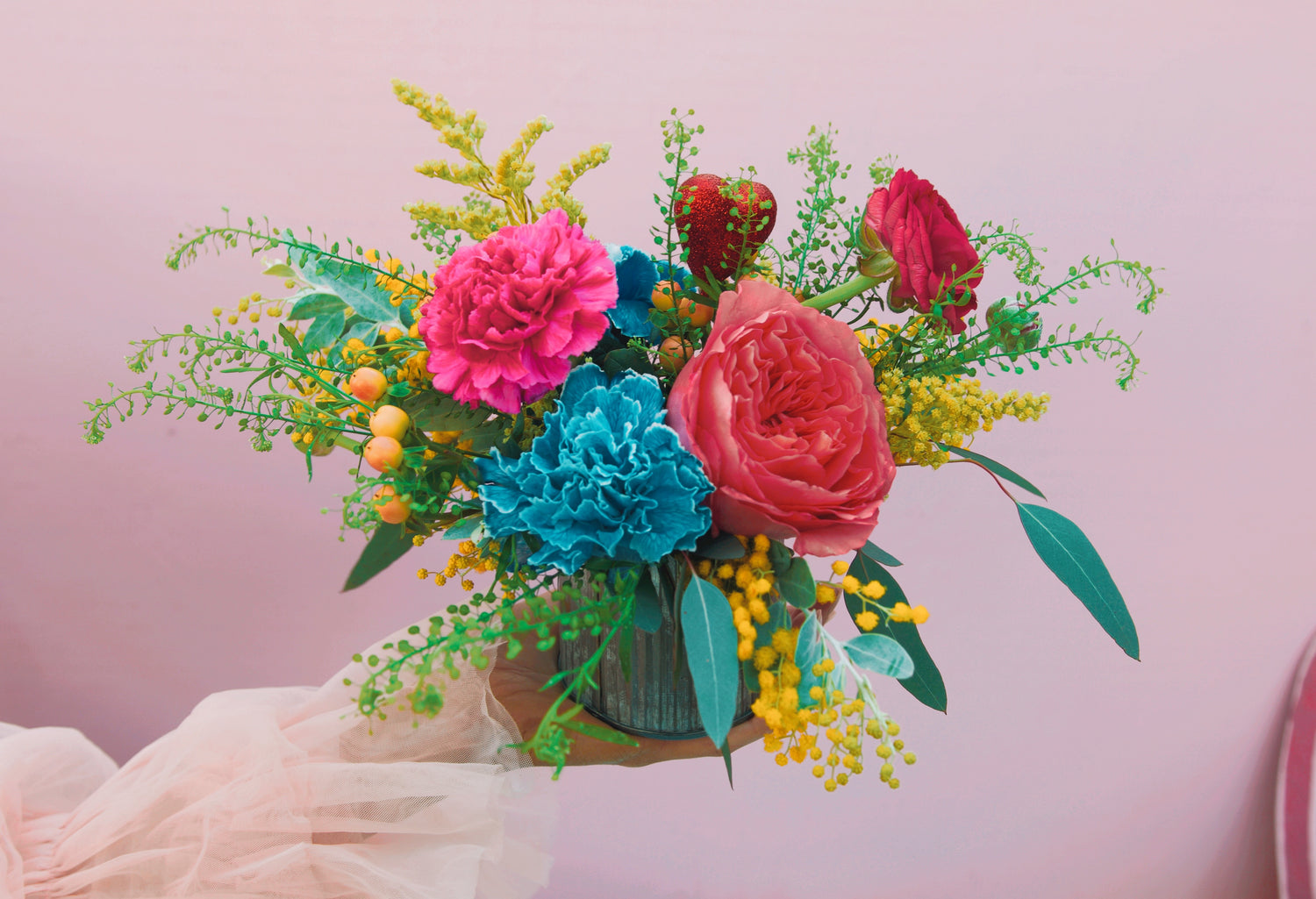 This designer's choice arrangement is comprised of specialty blue carnations, pink roses, & yellow blooming mimosa in a corrugated tin-- an homage to foil wrapped candies & sugars.