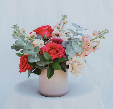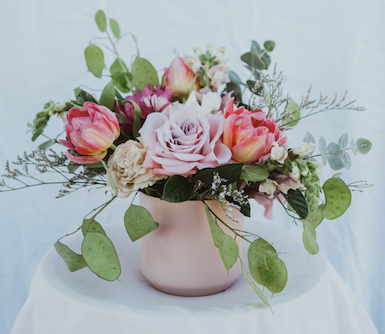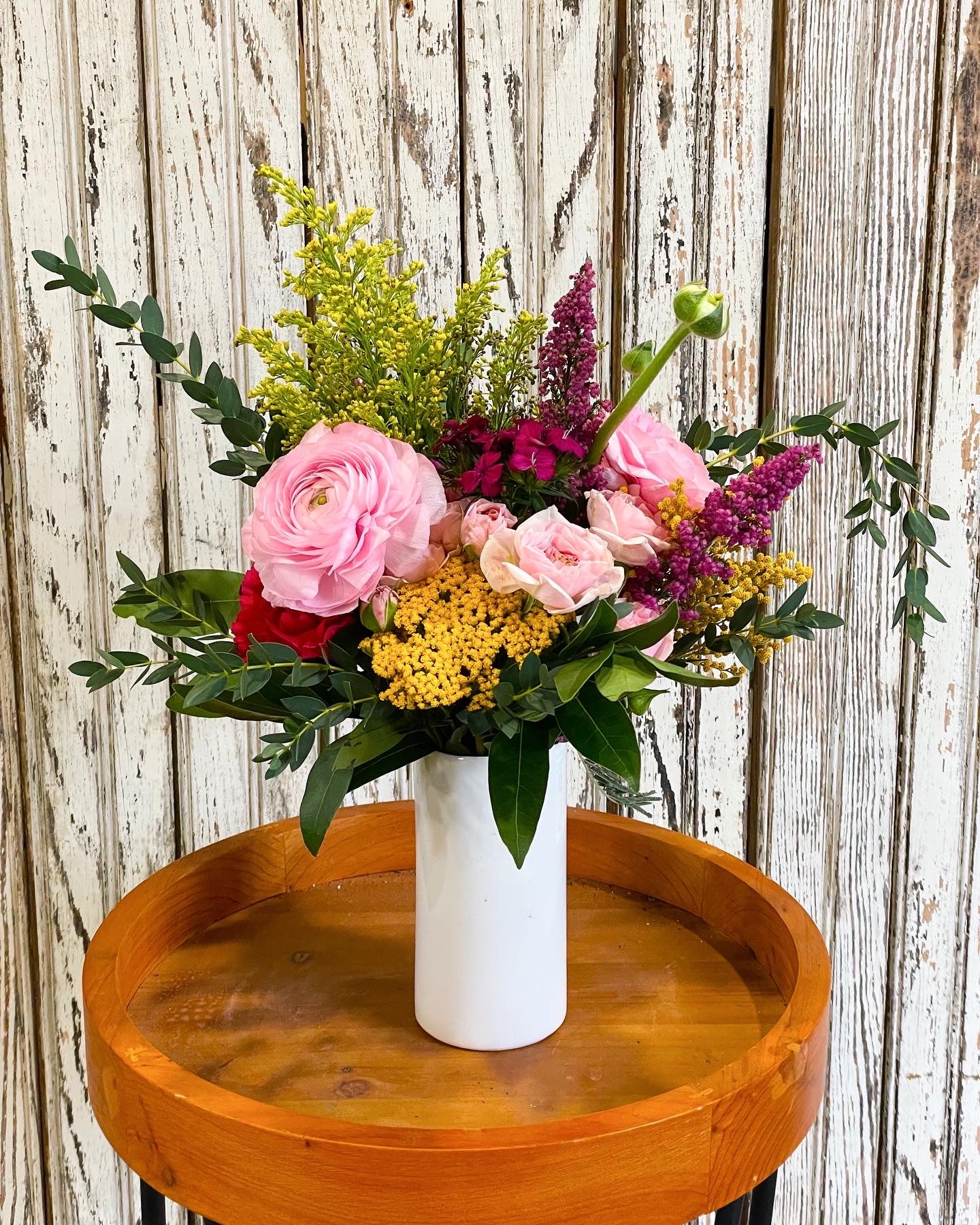 All vase arrangements come in unique ceramic or patinaed glass vases. We do not offer clear glass.