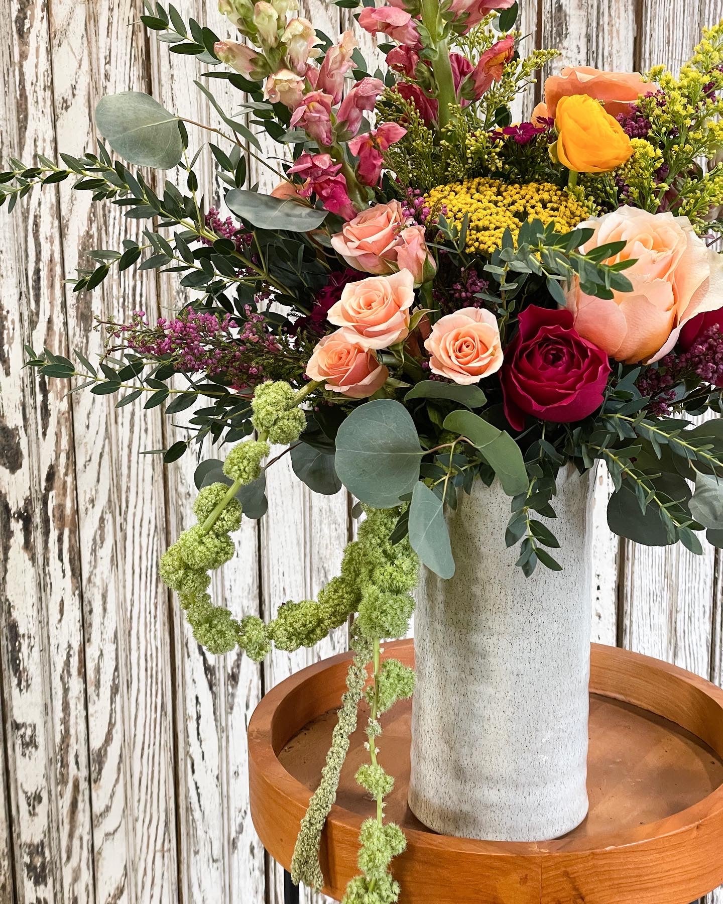 All vase arrangements come in unique ceramic or patinaed glass vases. We do not offer clear glass.